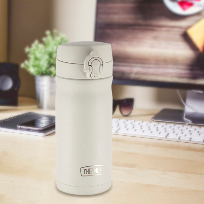 Thermos JMY 350 ml er en smart blanding af en lille termoflaske og en termokop fremstillet i rustfrit stål med et drikkelåg. Kan bruges til både til kolde og varme drikke.