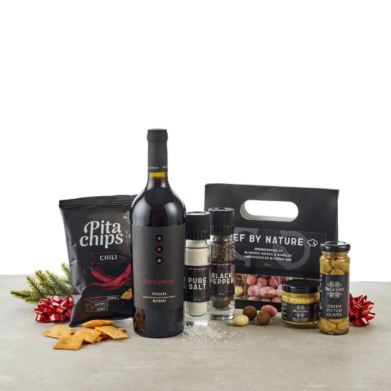 1 fl. Lucarelli, Puglia Rosso, Italien; CbyN Taske (Blandede nødder & mandler m/chokolade, Jordbærmandler og Brændte mandler) 270 g.; Brødchips - Chili 80 g.; Saltkværn 100 g.; Peberkværn 50 g.; Grov sennep 90 g.; Grønne Oliven 140 g.; Pakket i sort stofpose