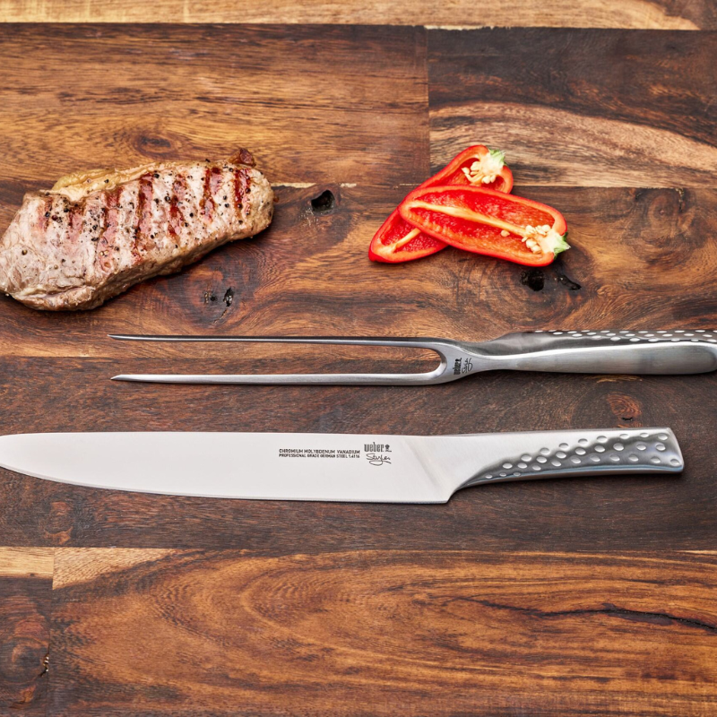 Skær dit grillede kød på samme måde, som du ville gå til dine grillerier: som en professionel kok! Deluxe-forskærersættets elegante kniv og gaffel er fremstillet af rustfrit stål og designet til at give dig det bedste greb og ultimativ skarphed. Så kan du skære i hvilket som helst stykke kød med et rent, smukt snit.