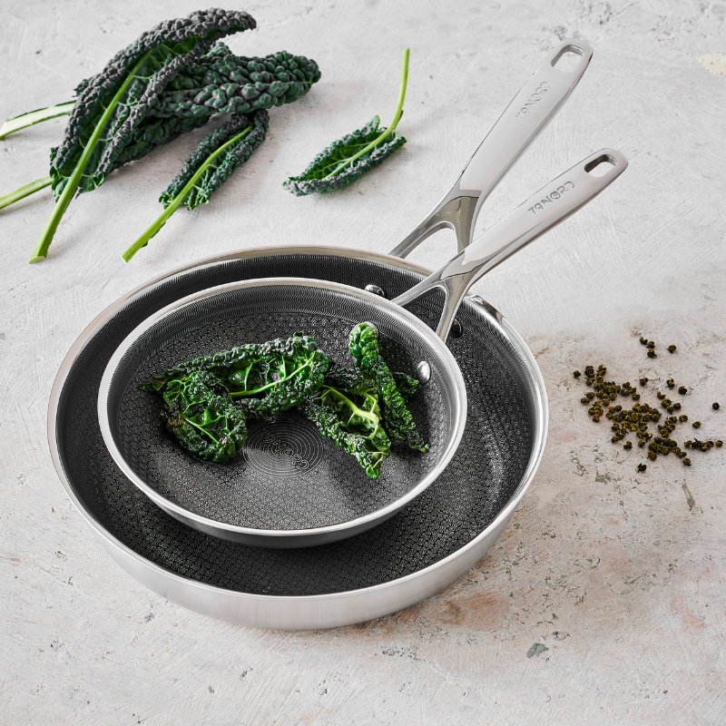 Konstruktionen af to lag stål med et aluminiumlag imellem betyder, at varmen fordeles hurtigt og fastholdes jævnt og energieffektivt over både bund og sider, og samtidig er materialet let. Udvendigt er gryder og pander satinpolerede, indvendigt har de en innovativ hybridbelægning. Hybridbelægningen er en kombination af et forhøjet mønster i rustfrit stål og en 2-lags keramisk belægning, produceret uden PFAS. er en kombination af et forhøjet mønster i rustfrit stål og en 2-lags keramisk belægning, produceret uden PFAS. De kan desuden anvendes i ovn, med låg op til 200 °C, uden låg helt op til 260 °C. Produkterne er velegnede til vask i opvaskemaskine, og vi anbefaler, at de også vaskes før første brug.