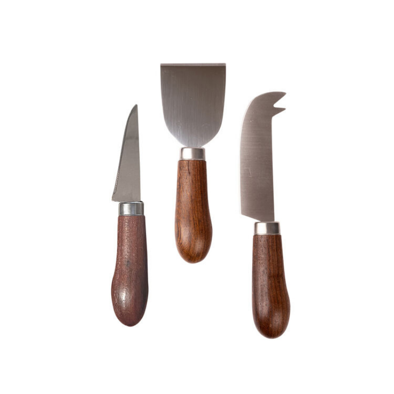 Astrid osteknive kombinerer rustfrit stål med elegante, buede skæfter i chokoladebrunt wengetræ. Serien fås som 3-pak med osteknive eller 2-pak med ostehøvl og smørekniv – et klassisk og stilrent design, der både er funktionelt og smukt.