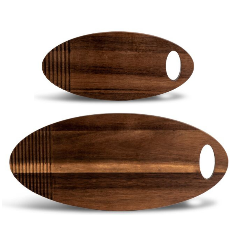 Ante skærebræt er håndlavet i mørkt, robust akacietræ og fås i to størrelser (30x13,5x2 cm og 50x22,5x2 cm). Den ovale form og de smukt udskårne striber i den ene ende gør brættet både dekorativt og praktisk. Hvert skærebræt har unikke variationer i form og farve, som kun håndlavede produkter kan have, og træets holdbarhed er skånsom mod knivene.