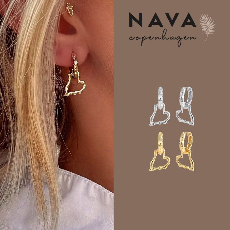 Aputi Earrings kombinerer bløde former med rå struktur i et design formet som et abstrakt hjerte. Det åbne vedhæng hænger fra en bølget creol og skaber en lethed, der balancerer det organiske udtryk. Overfladen har en ujævn, havformet tekstur, der fanger lyset og understreger smykkets naturlige karakter.