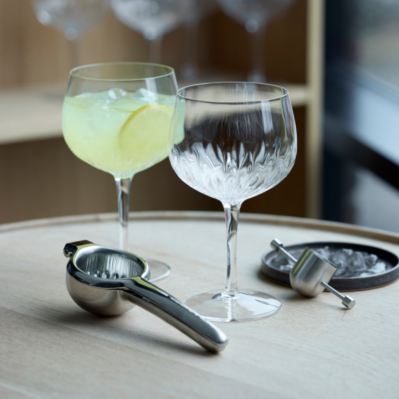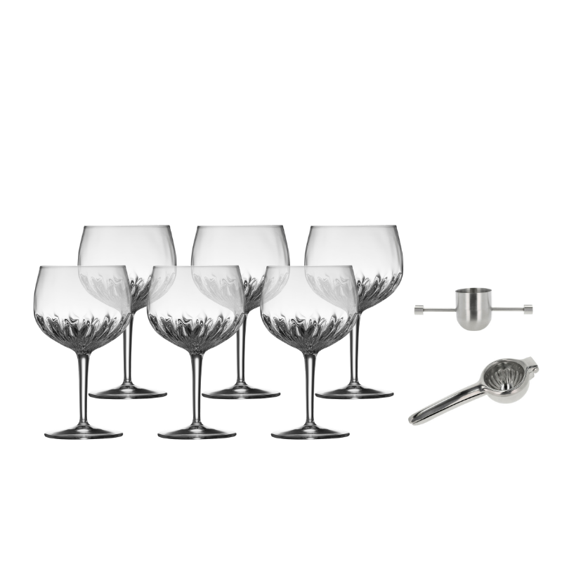 6 stk. smukke Mixology spansk gin & tonic-glas, 80 cl, HOLMs klassiske citruspresser af rustfrit stål samt et 2 cl vippemål i rustfrit stål fra Funktion – alt hvad du skal bruge for at blande en lækker cocktail.