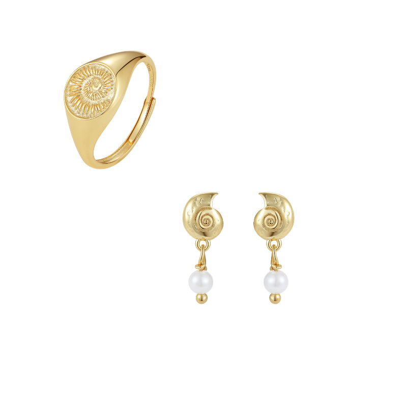 Aruba Earrings er elegante øreringe med et snoet konkylie-design og en svævende perle, der tilføjer bevægelse og lethed. Det fine spiralformede mønster og de små indgraveringer i overfladen leder tankerne hen på strandfund og havets skjulte detaljer. En feminin og raffineret silhuet, inspireret af kystens ro og mystik.