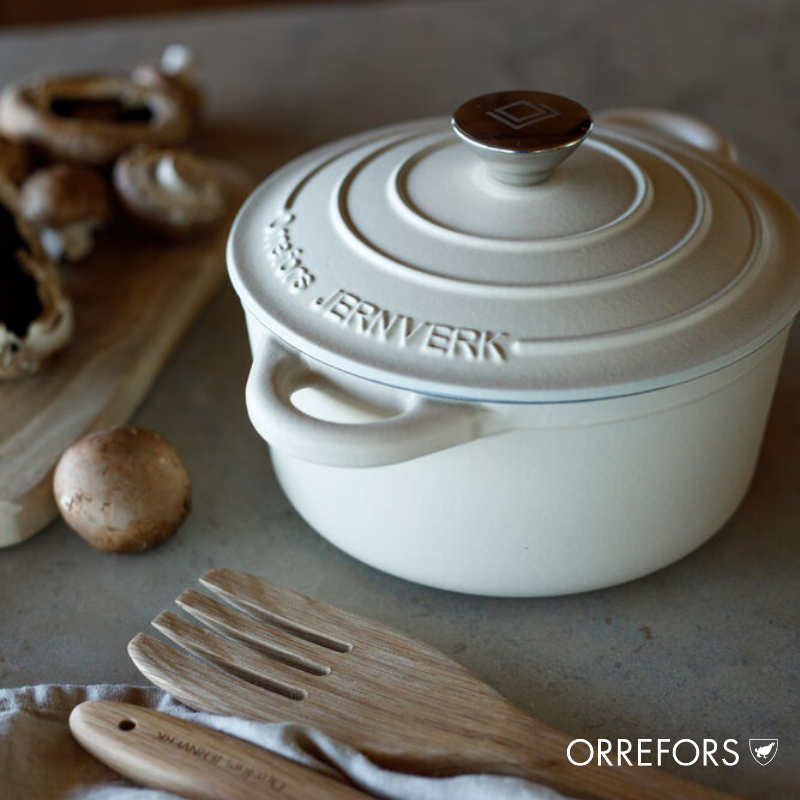En stor emaljeret støbejernsgryde, der rummer alt, vad du har behov for til et rigtigt festmåltid.