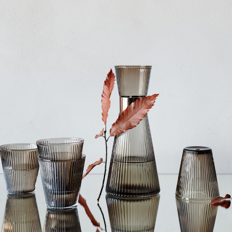 I denne gaveæske fra Rosendahl finder du funktionelt glasdesign til det moderne liv. Karaflen i mundblæst glas er let, både i udseende og vægtmæssigt, og det røgfarvede glas og det patinerede stålbånd er med til at skabe et helt særligt og stilfuldt udtryk. Glassene er designet til at passe perfekt ned i karaflens top, så glas og karaffel kan bæres med én hånd. Gaveæsken indeholder 2 Grand Cru Nouveau vandkaraffel 1 l og 8 Grand Cru Nouveau vandglas 26 cl.