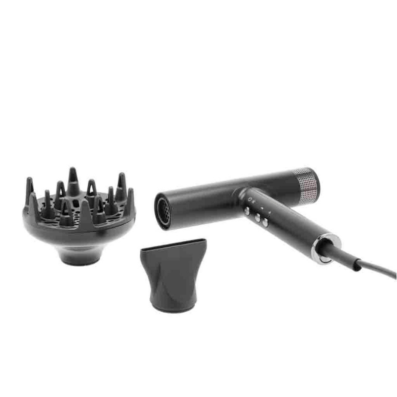Med denne hårtørrer får du et både elegant og effektivt hjælpemiddel i høj kvalitet og i flot, ergonomisk design. Den har en hastighed på 110.000 o/min, som gør den op til 7 gange hurtigere end en traditionel hårtørrer. Støjniveauet er lavt, 62 dB, og selve hårtørreren vejer kun 350 g (uden tilbehør og ledning).