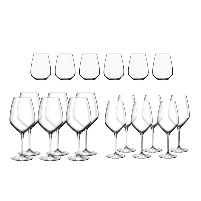 18 dele. Atelier er en del af Luigi Bormiolis Accademia-kollektion, der er udviklet til vinelskere og professionelle, der ønskerat få det absolut bedste ud af enhver vin. I hver serie er glassene derfor specialdesignede til at give de forskellige vintyper de mest optimale betingelser. Dette sæt indeholder 6 rødvinsglas Chianti 55 cl, 6 hvidvinsglas Sauvignon 35 cl og 6 vandglas 40 cl.