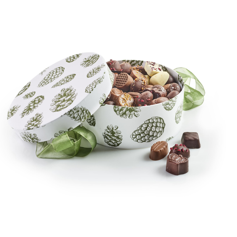 Hatteæske Grøn Kogle, Stor – Luksuschokolade 1000 g.