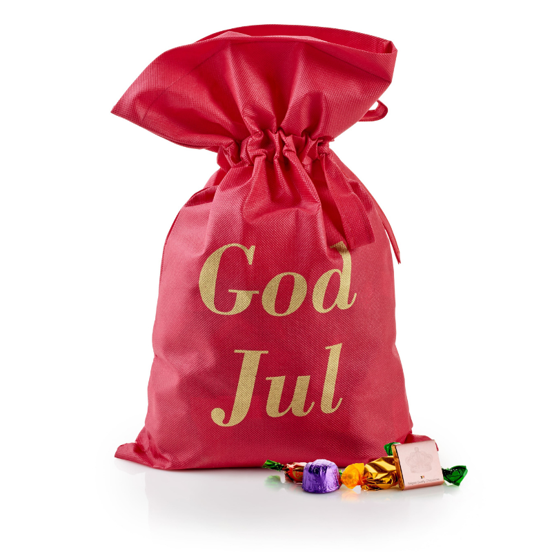 Rød stofpose - guldtryk "God Jul" m/1000 g. Cocktailmix; Mulighed for Private Label