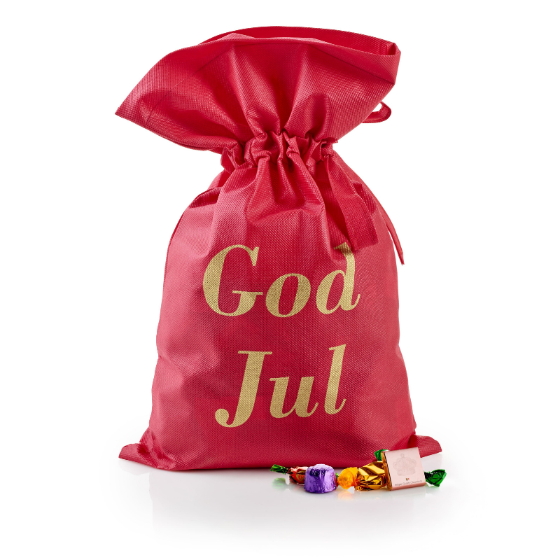 Rød stofpose - guldtryk "God Jul" m/2900 g. Cocktailmix; Mulighed for Private Label