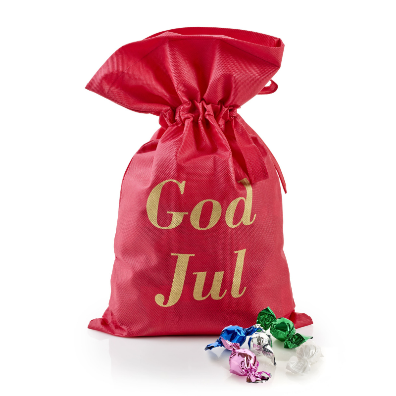Rød stofpose - guldtryk "God Jul" m/2900 g. Mixede Chokoladekugler; Mulighed for Private Label