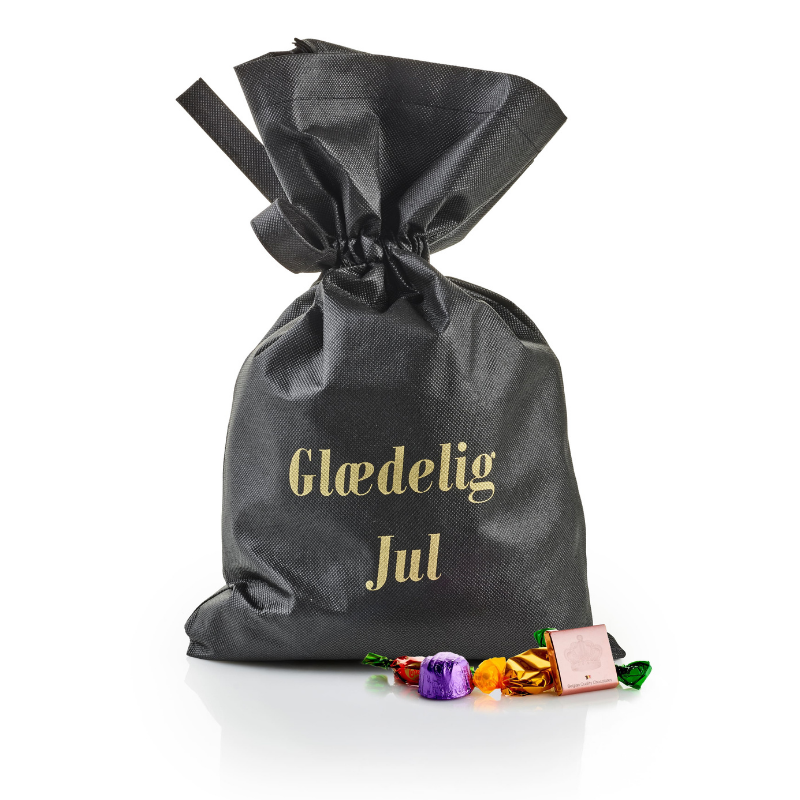 Sort stofpose - guldtryk "Glædelig Jul" m/1000 g. Cocktailmix; Mulighed for Private Label