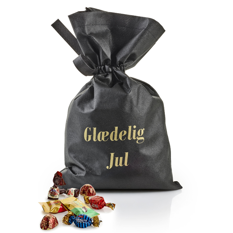 Sort stofpose - guldtryk "Glædelig Jul" m/1750 g. Toms Festival Mix; Mulighed for Private Label